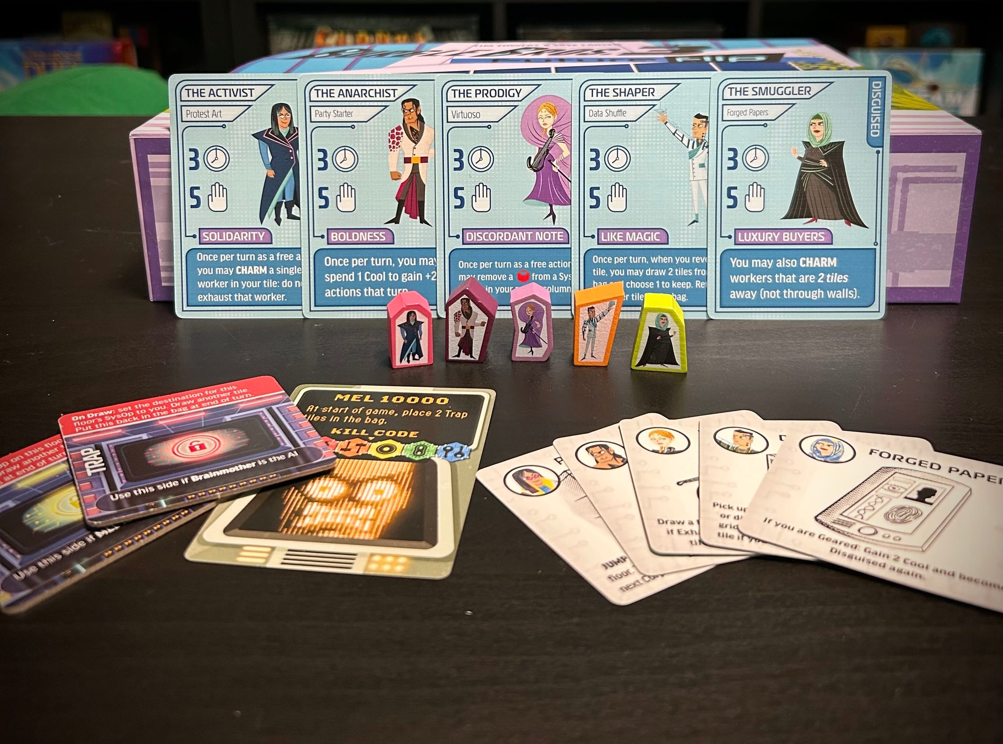 5 new characters to play pulled right from the Netrunner universe. Each one comes with a two unique thematic powers - one for their disguised mode, and one for their geared mode on the back side of their card. Each side has custom artwork. The also have a special tool card to use when the time is right. They each have a custom wood token, heat transfer printed on both sides!